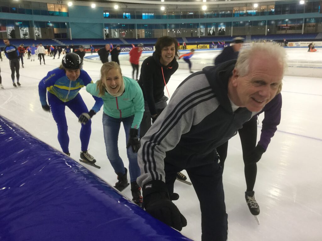 (Image below) A group photo of a Dutch family – Grandparents, Parents and Grandchildren – all enjoying Ice Skating in Thialf ,Heerenveen. At the Thialf rink we watched some of the best skaters in the world training.